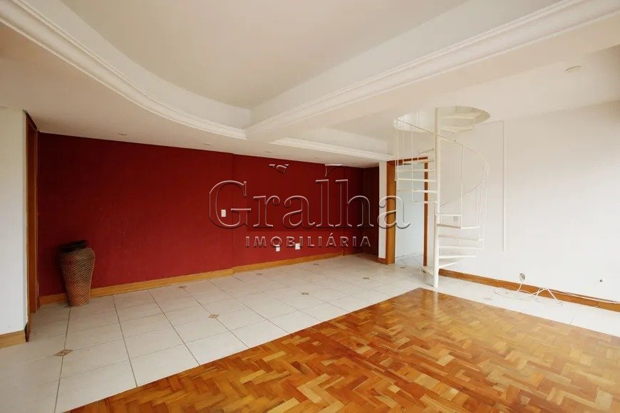 Na parte inferior, amplo living 2 ambientes, teto de gesso rebaixado, piso parquet, lavabo, 1 dormitório, suíte, Copa/cozinha e área de serviço.
